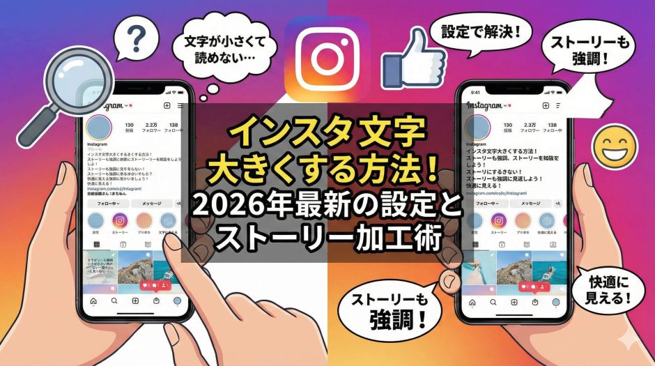 本記事では、インスタの文字を大きくするためのあらゆる方法を網羅しました。「見る時」の読みやすさを改善する本体設定から、「投稿する時」に文字を特大にしてインパクトを出す編集テクニックまで、iPhone・Androidそれぞれの操作手順を徹底解説します。